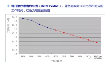 需要說明的是,有些技術(shù)本身并不是為了加快治療速度而發(fā)展起來的,例如,大分割放療技術(shù),其發(fā)展的本質(zhì)是基于其生物效應(yīng)優(yōu)勢。但是我們不能否認(rèn),該技術(shù)的發(fā)展確實減少了定擺位的累計次數(shù)和時間,等于是減少了整個的治療時間,有利于在同樣多的時間里可以治療更多的患者。同樣,多采用VMAT技術(shù),和普通IMRT相比,也能減少工作時間。如下圖所示: