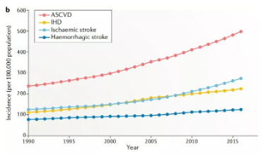 腦卒中、冠心病等心血管疾病(Cardiovascular disease,CVD)是造成我國居民死亡和疾病負(fù)擔(dān)的首要病因,占中國死亡人口的40%,CVD發(fā)病率呈現(xiàn)逐年快速攀升的趨勢,目前我國CVD患者超過 2.9 億例。動脈硬化性心血管疾病(Atherosclerotic cardiovascular disease,ASCVD)是一種單一類型的心血管疾病,包括缺血性卒中(Ischaemic stroke)和缺血性心臟?。↖schaemic heart disease,IHD)。從1990年至2016年,ASCVD的死亡人口增加近100萬,據(jù)統(tǒng)計(jì)2016年約有240萬人死于ASCVD,占CVD總死亡人口的61%,占所有死亡的25%。