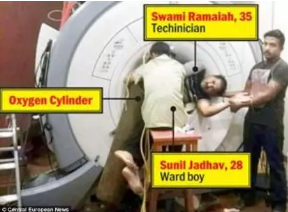 2014年11月8日,印度新孟買的塔塔紀(jì)念醫(yī)院發(fā)生了一起罕見的磁共振事故,當(dāng)時(shí),一名男性患者被推入醫(yī)院接受磁共振檢查。在掃描過程中,主治醫(yī)生讓28歲的護(hù)工Sunil Jadhav去取一個(gè)氧氣面罩。Jadhav從來沒有在MRI檢查室工作過,也不知道MRI附近不允許有任何金屬,他以為醫(yī)生是讓自己去取一個(gè)氧氣瓶。