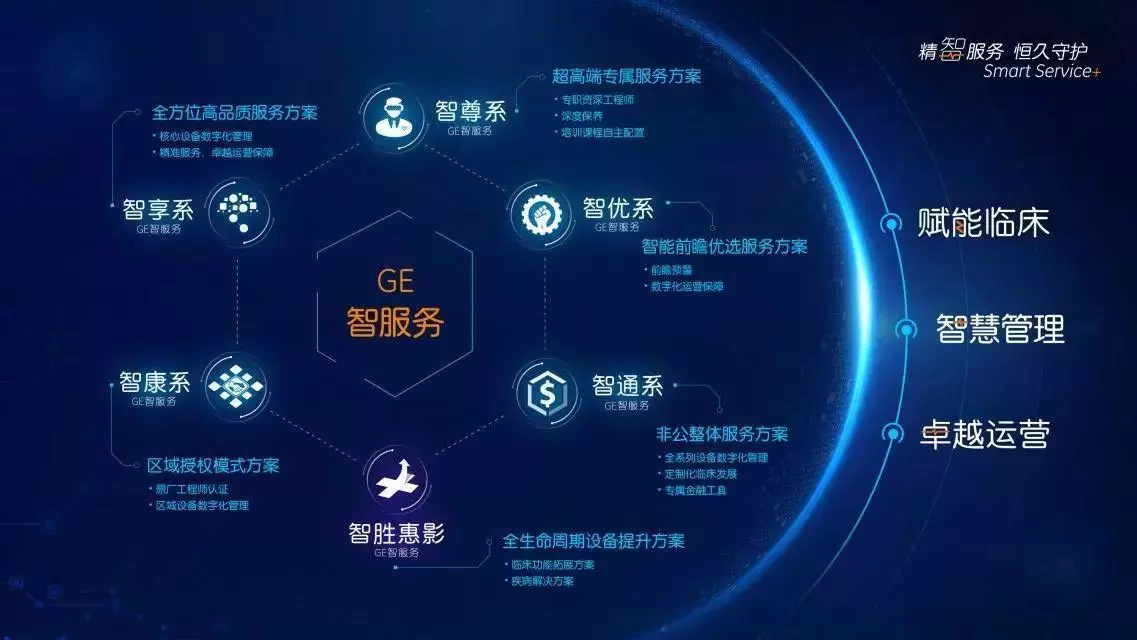 GE醫(yī)療客戶服務部推出全新升級的“精智服務,恒久守護”數(shù)字化服務戰(zhàn)略,并在數(shù)字化戰(zhàn)略升級平臺基礎上針對不同的客戶需求向市場推出全新升級的“GE智服務”六大方案:智尊系、智享系、智優(yōu)系、智康系、智通系、智勝惠影。
