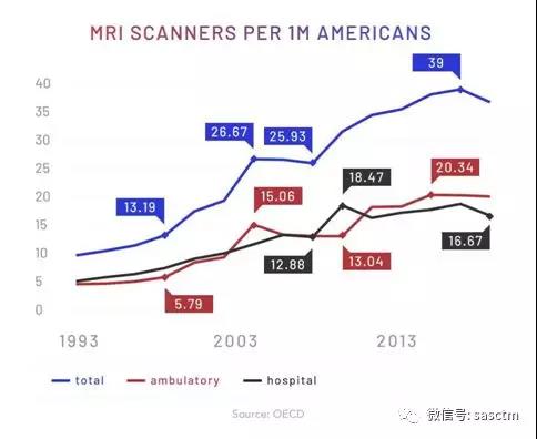 到2016年,平均每1千名美國人大約接受了121次MRI掃描檢查。而在加拿大和澳大利亞,這一數(shù)字分別是56和43次。最近的觀點(diǎn)是MRI是美國過于昂貴的醫(yī)保支付系統(tǒng)的終極力證。成為了拖垮美國醫(yī)保費(fèi)用的“原罪”之一。