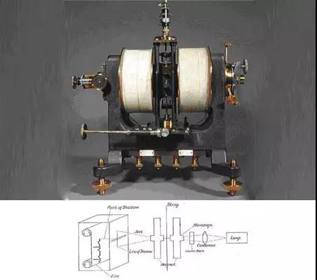 因?yàn)槊?xì)管靜電計(jì)的毛細(xì)血管不可能做的太細(xì),他無法測(cè)到更精確的電流,愛因托芬改進(jìn)了這個(gè)裝置,他利用通電的導(dǎo)體可以產(chǎn)生磁場(chǎng)的安培右手定律發(fā)明了----磁電式儀表。愛因托芬把提高靈敏度的任務(wù)完全交給超大的電磁鐵,而動(dòng)圈以匝數(shù)最少,質(zhì)量最輕為目標(biāo)。最終的結(jié)果是1895年推出的弦線式電流計(jì)---看清楚還不是心電圖機(jī)。