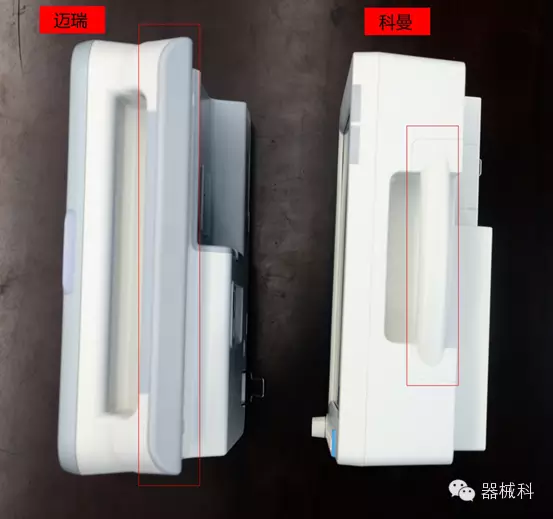科曼與邁瑞因機(jī)身尺寸上有區(qū)別,所以手柄方面,科曼明顯比邁瑞要小??坡捎么蠡《?,呈現(xiàn)橢圓截面的設(shè)計(jì);邁瑞采用方形小圓角,折疊活動(dòng)式的提手,塑膠包裹。手柄嬌小,不利于握持,但重心集中,更穩(wěn)定;手柄碩大,活動(dòng)范圍廣,卻也容易晃動(dòng)。