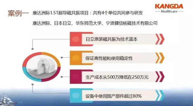 他列舉了康達洲際1.5T超導磁共振項目:在此項目的突破上,康達積極和大專院校進行技術合作。同上海華東師范大學磁共振實驗室(上海市重點實驗室)進行深度合作,雙方的科研團隊精誠合作,在剩磁處理,自動勻場、新臨床序列開放、圖像深度處理等一系列研發(fā)目標上均取得突破,并實際應用到康達產(chǎn)品中去,實現(xiàn)了從“實驗室”到“車間”的無縫銜接,真正將中國本土智慧展現(xiàn)在實業(yè)之中。