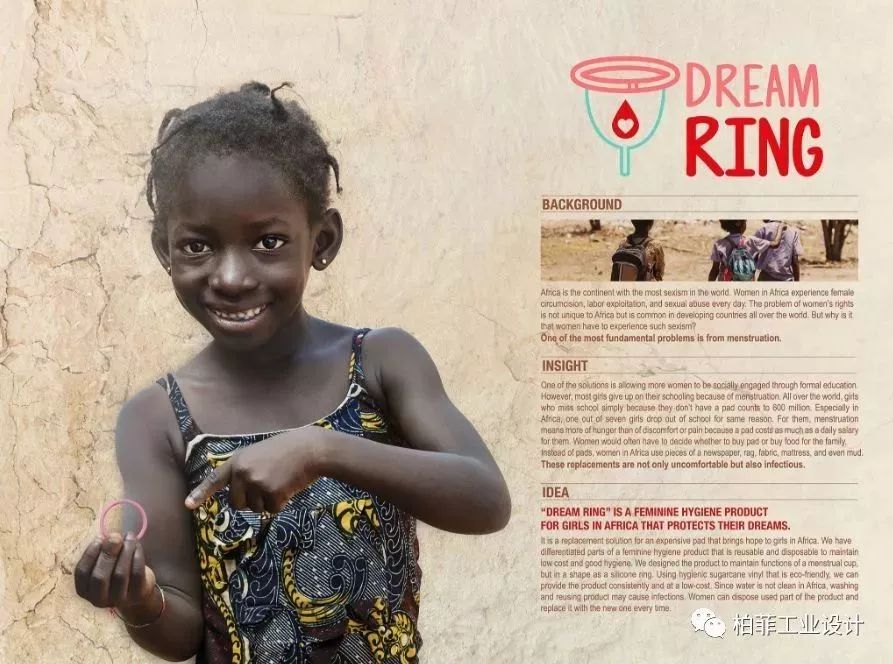 設計說明:非洲婦女每天都會經歷性別偏見和歧視,而針對這個問題所提出的解決方案是讓更多的女性參與正規(guī)教育。無法取得便宜且衛(wèi)生的女性衛(wèi)生用品是許多非洲女孩放棄上學的主要原因之一。一片衛(wèi)生棉可能會花掉一天的工資,迫使婦女在經期來時會使用報紙、破布、布料甚至泥土。DREAM RING是一款便宜又環(huán)保的女性衛(wèi)生用品,由矽膠環(huán)和甘蔗乙烯制成??芍貜褪褂玫奈z環(huán)和拋棄式的甘蔗乙烯是DREAM RING既經濟又安全的關鍵因素。