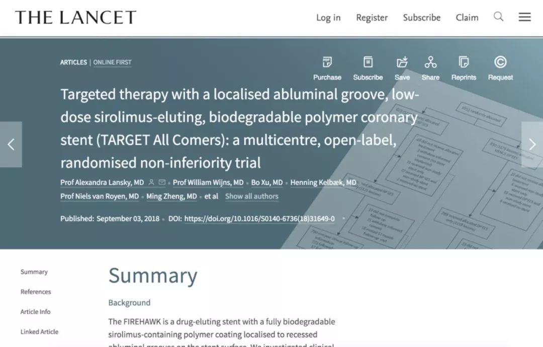 2018年9月,一項由10個國家和地區(qū)21家機構(gòu)聯(lián)合參與的一項大型臨床試驗成果,首次刊登在《柳葉刀》上,這項試驗證實:中國自主研發(fā)的心臟冠脈藥物洗脫支架“火鷹”(FIREHAWK),使用了最少的藥劑量,因而獲得了最高的安全性,而同時在療效上與國際頂尖的XIENCE支架媲美。