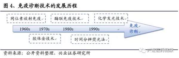 免疫診斷的發(fā)展需要依靠免疫學(xué)技術(shù)的不斷革新,免疫診斷的變革依次經(jīng)歷了放射免疫檢驗(yàn)(RIA)、膠體金快速檢驗(yàn)、酶聯(lián)免疫檢驗(yàn)(ELISA)、時(shí)間分辨熒光免疫(TRFIA)的迭代,最終迎來(lái)了化學(xué)發(fā)光免疫檢驗(yàn)(CLIA)的時(shí)代。