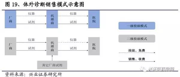 醫(yī)院是產(chǎn)業(yè)鏈上最強(qiáng)勢(shì)的一環(huán),國(guó)產(chǎn)產(chǎn)品對(duì)醫(yī)院的吸引力決定著國(guó)產(chǎn)替代進(jìn)程。在銷售模式上,公司多采用直銷和經(jīng)銷相結(jié)合,以經(jīng)銷為主。對(duì)于醫(yī)院終端,儀器基本以投放獲得,廠商以搭配銷售試劑的方式獲得收益。體外檢測(cè)等醫(yī)療服務(wù)由政府統(tǒng)一定價(jià),應(yīng)用化學(xué)發(fā)光法可相應(yīng)提高收費(fèi)標(biāo)準(zhǔn)(例如:福建省用化學(xué)發(fā)光法可加價(jià)80%)。因此,試劑屬于醫(yī)院的“成本項(xiàng)”,醫(yī)院有動(dòng)力對(duì)檢測(cè)方法進(jìn)行升級(jí)迭代,但卻并沒(méi)有動(dòng)力去特意抬高價(jià)格,在相同條件下會(huì)考慮試劑性價(jià)比,相對(duì)市場(chǎng)化。