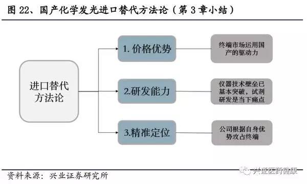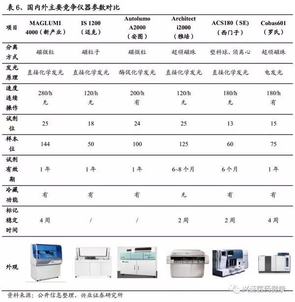 從以上進(jìn)程可看出,技術(shù)到位、價(jià)格優(yōu)勢(shì)以及找準(zhǔn)市場(chǎng)切入口是其完成進(jìn)口替代的關(guān)鍵。發(fā)光行業(yè)與生化行業(yè)有其區(qū)別,發(fā)光本質(zhì)為免疫反應(yīng),各廠家的技術(shù)平臺(tái)完全不同,為保證結(jié)果的準(zhǔn)確性和穩(wěn)定性,將迫使檢驗(yàn)人員使用同一廠家提供的試劑和分析儀。在各大醫(yī)院對(duì)于各個(gè)項(xiàng)目的檢查都基本專機(jī)專用,未來(lái)也很難將其開(kāi)放化。所以,在發(fā)光的進(jìn)口替代進(jìn)程中,試劑和儀器的一體化研發(fā)是必須的。國(guó)內(nèi)化學(xué)發(fā)光龍頭企業(yè),例如,新產(chǎn)業(yè)、安圖生物、邁克生物等都具備試劑和儀器的一體化研發(fā)能力。參考生化的替代道路,5年內(nèi)將爆發(fā)大規(guī)模進(jìn)口替代。