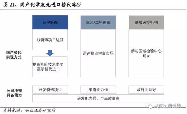 對(duì)于三甲醫(yī)院,其技術(shù)偏好較高,從目前的市場(chǎng)反應(yīng)來(lái)看,國(guó)產(chǎn)發(fā)光儀器和試劑的精確性和穩(wěn)定程度仍不能達(dá)到三甲醫(yī)院的要求。同時(shí)三甲醫(yī)院多有聲譽(yù)追求,對(duì)進(jìn)口品牌的忠誠(chéng)度高。在價(jià)格上,樣本量大、檢驗(yàn)結(jié)果質(zhì)量要求高、檢驗(yàn)人員成本高致使其相對(duì)價(jià)格不敏感。而國(guó)內(nèi)廠家對(duì)于試劑的研發(fā)仍停留在檢測(cè)項(xiàng)目的拓展上,基于現(xiàn)狀,大規(guī)模進(jìn)口替代較難實(shí)現(xiàn)。有些特殊項(xiàng)目未涉及,如藥物濃度檢測(cè)等,可作為突破口進(jìn)駐高端醫(yī)院,建立品牌形象??傮w來(lái)說(shuō),短期內(nèi)國(guó)內(nèi)廠商可依靠特殊項(xiàng)目檢查可獲得三級(jí)醫(yī)院小部分份額,長(zhǎng)期來(lái)看,想進(jìn)駐高端醫(yī)院并獲得主力項(xiàng)目的份額,須加大研發(fā)投入,做好做精發(fā)光試劑,打破醫(yī)院對(duì)于國(guó)產(chǎn)山寨的慣性認(rèn)知。