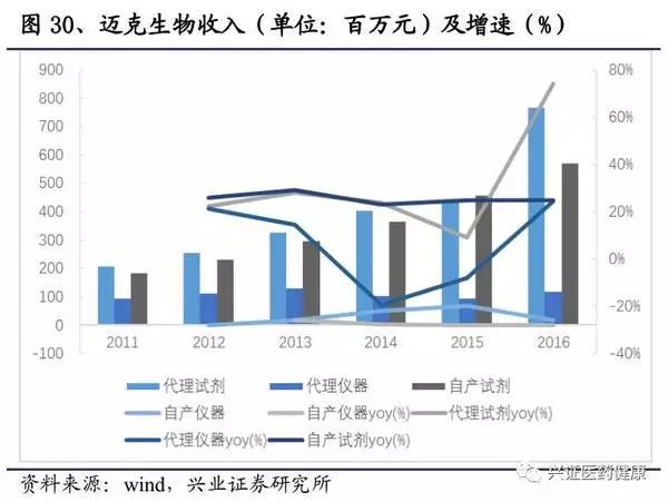 產(chǎn)品線布局全面,放量開(kāi)啟。邁克早期產(chǎn)品主要是生化試劑,通過(guò)代理和自產(chǎn),公司不斷豐富產(chǎn)品線。從產(chǎn)品布局來(lái)看,公司與海外龍頭羅氏、雅培類似,采取全覆蓋戰(zhàn)略。隨著行業(yè)的發(fā)展,終端對(duì)于產(chǎn)品的需求從單產(chǎn)品轉(zhuǎn)為整體解決方案,產(chǎn)品線延長(zhǎng),保障了未來(lái)的增速。短期內(nèi),邁克發(fā)光的快速增長(zhǎng)可以有效帶動(dòng)收入與利潤(rùn)的增長(zhǎng),其他細(xì)分產(chǎn)品線在2017年以后也即將放量。