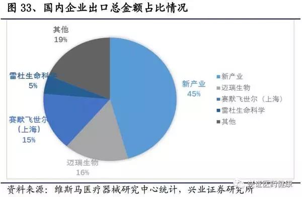 渠道能力強(qiáng),國(guó)內(nèi)外銷售情況表現(xiàn)不俗。新產(chǎn)業(yè)采用經(jīng)銷為主,直銷為輔的模式進(jìn)行銷售。在國(guó)內(nèi)市場(chǎng),新產(chǎn)業(yè)終端用戶分布范圍廣,省份分散,覆蓋醫(yī)院3000多家。其中,二級(jí)醫(yī)院有1千多家,三級(jí)醫(yī)院近1千家,一級(jí)醫(yī)院較少。今后,一級(jí)醫(yī)院市場(chǎng)將被充分開(kāi)發(fā),將通過(guò)自購(gòu)或者區(qū)域檢驗(yàn)中心的方式,將免疫檢測(cè)技術(shù)更新至化學(xué)發(fā)光法,市場(chǎng)空間巨大。在出口方面,儀器出口收入占到總收入近一半,試劑出口收入占到10%左右。2016年出口總額為國(guó)內(nèi)第一,占到總金額的45.6%。