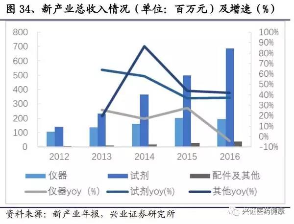 新產(chǎn)業(yè)2016年總收入9.23億元,絕大部分為發(fā)光產(chǎn)品,2012-2016年,新產(chǎn)業(yè)收入復(fù)合增速保持在37%左右。其中試劑增速較高,保持在35%以上,隨著儀器投放的增加,試劑的增速將會(huì)上升。由于近幾年空白市場(chǎng)將逐漸被消化,儀器的增速將呈現(xiàn)下降的態(tài)勢(shì)。