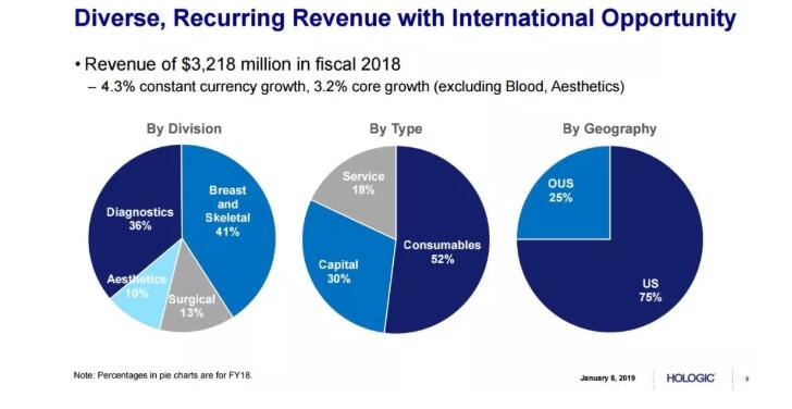 近五年來,豪洛捷財務(wù)增長穩(wěn)健。2018年,豪洛捷公司實現(xiàn)收入32.179億美元,利潤增長強(qiáng)勁,每股凈收益EPS達(dá)2.23美元。其中,乳腺健康和診斷業(yè)務(wù)始終有不俗表現(xiàn)。盡管醫(yī)學(xué)美容業(yè)務(wù)受到FDA相關(guān)政策的影響,但豪洛捷以16.5億美元收購Cynosure的大動作表明了它進(jìn)軍醫(yī)療美容界的野心。產(chǎn)品、服務(wù)和資本收入三足鼎立。從地域來看,豪洛捷的市場主要還是集中在美國,國際化的潛力巨大。