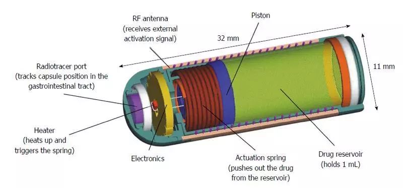 當(dāng)彈簧釋放時(shí),Enterion能夠通過(guò)9毫米開(kāi)口輸送任何類型的藥物配方(包括干粉,半固體,懸浮液或溶液配方),迫使活塞沿著膠囊的軸移動(dòng),從而,清空所述容器到胃腸道的特定位置。將放射性標(biāo)記物放置在單獨(dú)的密封示蹤劑端口內(nèi),以允許使用γ閃爍掃描法實(shí)時(shí)觀察膠囊位置?;钊倪\(yùn)動(dòng)還操作開(kāi)關(guān),該開(kāi)關(guān)以精確的頻率傳輸弱無(wú)線電信號(hào)。這個(gè)信號(hào)的檢測(cè)從外部確認(rèn)膠囊已成功?;钊\(yùn)動(dòng)在膠囊末端附近停止,這保持了密封并防止內(nèi)部電子元件與GI流體接觸。