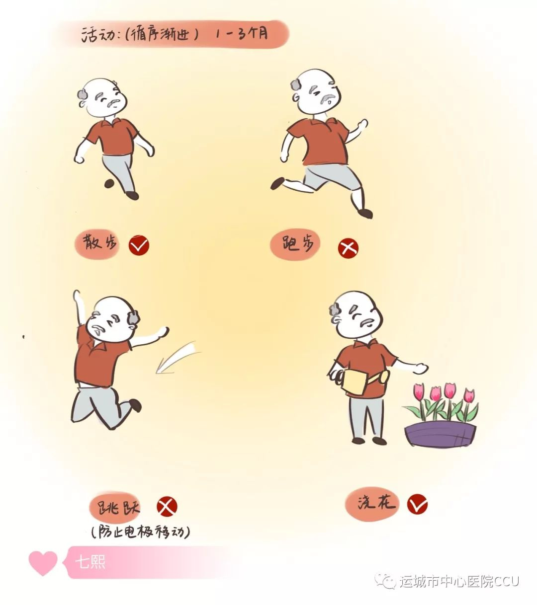 出院后1--3個(gè)月,活動(dòng)應(yīng)循序漸進(jìn),防止電極移位。