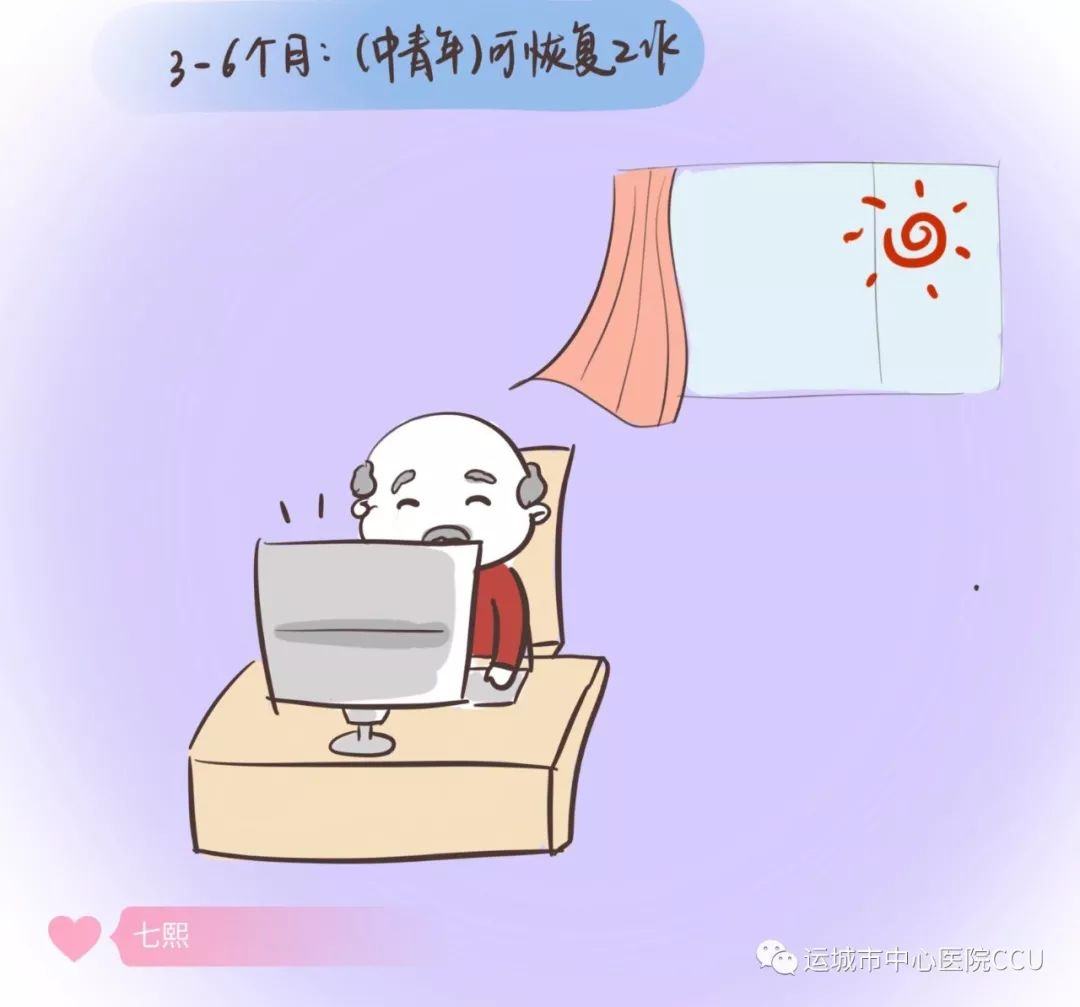 出院后3--6個(gè)月:中青年可恢復(fù)工作,應(yīng)注意勞逸結(jié)合。